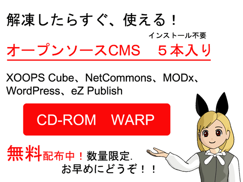 7月1日、2日に東京国際フォーラムで開催された「オープンソースワールド」に参加してきました。「オープンソースコンソーシアム CMS部会」として話題のCMSが5本入ってすぐに使える WARP CD を配ったところ、大好評で2日目の午後に早くも品切れ状態となってしまいました。